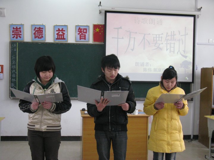 在班會(huì)的第三個(gè)環(huán)節(jié)中:三位同學(xué)朗誦了一首題為《千萬(wàn)不要錯(cuò)過(guò)》的詩(shī)歌,青春的聲音在教室里久久回蕩。