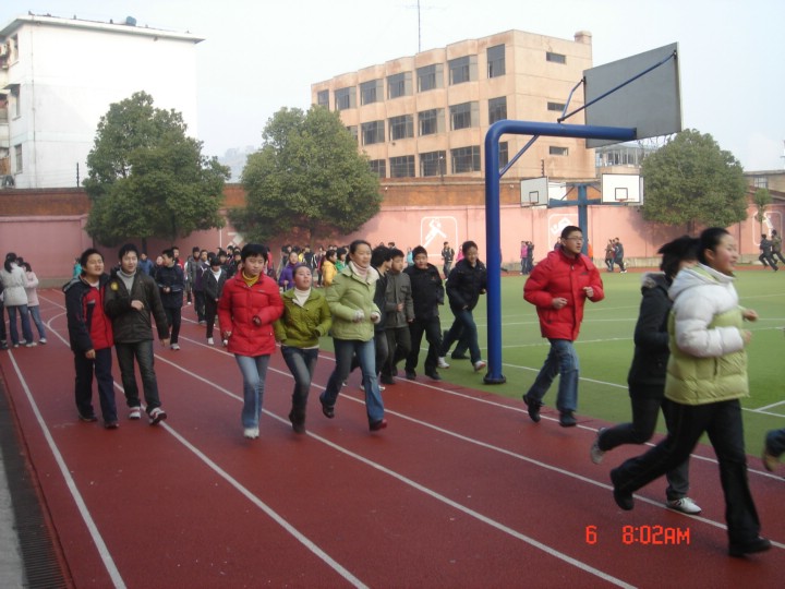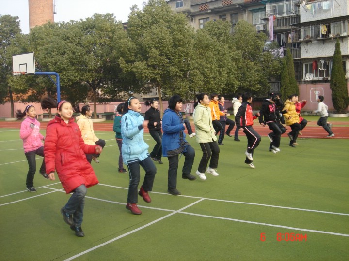 場地小、學(xué)生多,這是我校開展陽光體育運(yùn)動(dòng)面臨的最大困難,我們用“分時(shí)段、多形式”的方法克服了這一難題,最大限度地使更多的學(xué)生每天都堅(jiān)持體育鍛煉。早操后到第一堂課預(yù)備前這段時(shí)間是晨練的高峰期,有許多班級(jí)在班主任的組織下,進(jìn)行著各種形式的鍛煉,操場上一片沸騰。初二年級(jí)同學(xué)有序地繞著跑道練習(xí)長跑,初一年級(jí)的同學(xué)便在操場中間跳繩、立定跳遠(yuǎn)或者原地高抬腿。下午放學(xué)后,是運(yùn)動(dòng)的黃金時(shí)期,這是特意留給初三的同學(xué)的,此時(shí),當(dāng)他們?cè)谂艿郎蠐]灑汗水時(shí),初一初二的同學(xué)正在乒乓球臺(tái)、籃球場、前操場進(jìn)行著豐富多彩的課外體育活動(dòng)呢!