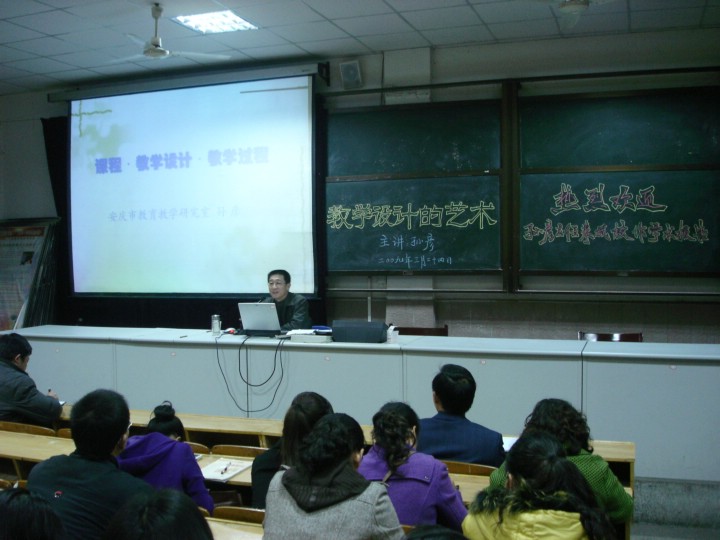 孫主任以一位教育研究者的身份,就完整的理解課程,教學(xué)設(shè)計(jì)的探究及教學(xué)過程的優(yōu)化這三個(gè)方面進(jìn)行了理論性的闡述,并列舉了一系列典型的教學(xué)案例深入剖析。他認(rèn)為:教師只有完整而準(zhǔn)確的理解課程,才能以此來進(jìn)行教學(xué)設(shè)計(jì),解決教什么和怎么教的實(shí)質(zhì)問題,同時(shí)他還強(qiáng)調(diào)了教學(xué)過程的優(yōu)化,教師要不斷追求教學(xué)藝術(shù),以期達(dá)到教學(xué)的三種境界:授人以業(yè)、授人以法、授人以道。在報(bào)告即將結(jié)束時(shí),孫主任對安外教師所取得的教育教學(xué)成績給予了高度的肯定并寄予了廣大青年教師殷切的希望:要不斷完善個(gè)人的專業(yè)知識和教學(xué)素養(yǎng),盡快成為教育教學(xué)中起到中流砥柱作用的一股力量。