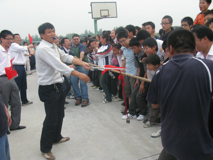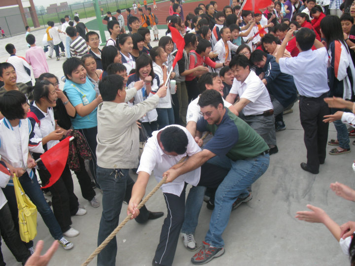 2009年5月23日下午,學(xué)校工會(huì)組織的教工拔河比賽在籃球場(chǎng)舉行。比賽共分行政組、初中組以及小學(xué)和高中聯(lián)隊(duì)組三個(gè)組進(jìn)行循環(huán)賽。本著“友誼第一,比賽第二”的宗旨,大家都以飽滿的熱情和昂揚(yáng)的斗志投入到比賽活動(dòng)中來(lái)。參賽老師們個(gè)個(gè)精神抖擻,團(tuán)結(jié)一心,經(jīng)過(guò)幾番苦戰(zhàn),比賽終于在吶喊加油聲中決出勝負(fù),勝利落下幃幕。經(jīng)過(guò)激烈的角逐,最后行政組取得了第一名。
