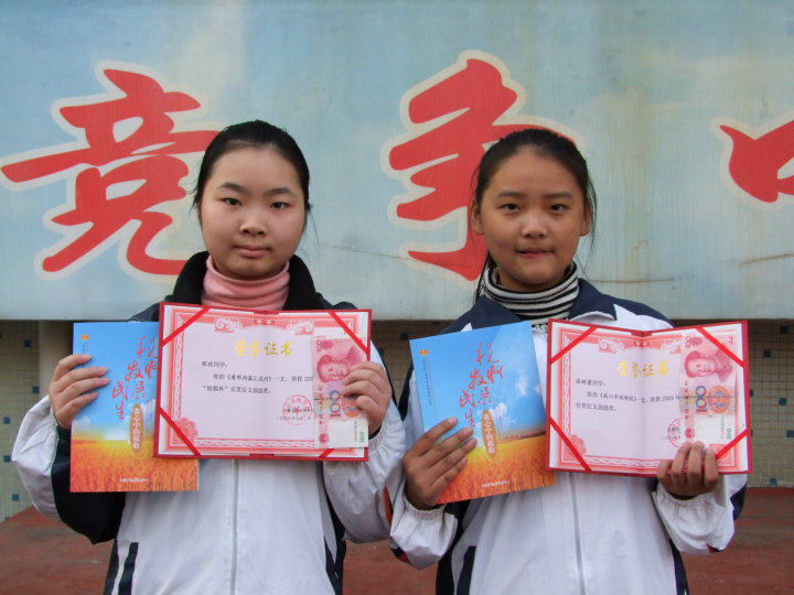 我校初二(9)班張皓蕾同學、初三(8)班程琰同學在2009年4月“安慶市地稅征文比賽”中榮獲一等獎,同時,他們也是我市推薦參加安徽省“地稅杯”征文比賽獲獎的僅有的兩位選手,為安慶市和安慶市外國語學校爭得了榮譽。在此,學校對他們表示熱烈的祝賀。