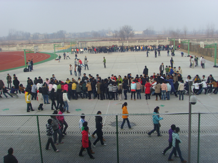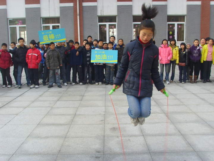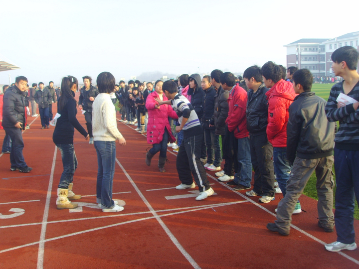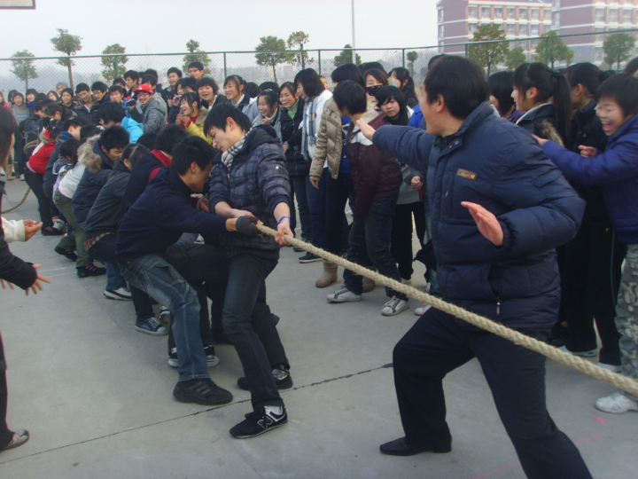 這天,初一年級的比賽項(xiàng)目是跳繩比賽,初一年級12個(gè)班每班10人參加比賽,以總成績決定勝負(fù)。初二年級的比賽項(xiàng)目是兩人三足迎面接力,每班20人參加。初三年級為配合中考,選擇的比賽項(xiàng)目是10乘400米接力比賽。高一和高二年級分別進(jìn)行了拔河比賽,每班20人參加。不同的年級,不同的項(xiàng)目,不同的場地;一樣的熱鬧,一樣的精彩,一樣的激烈,讓學(xué)生們完全煥發(fā)出青春的活力,讓校園里成為歡樂的海洋。