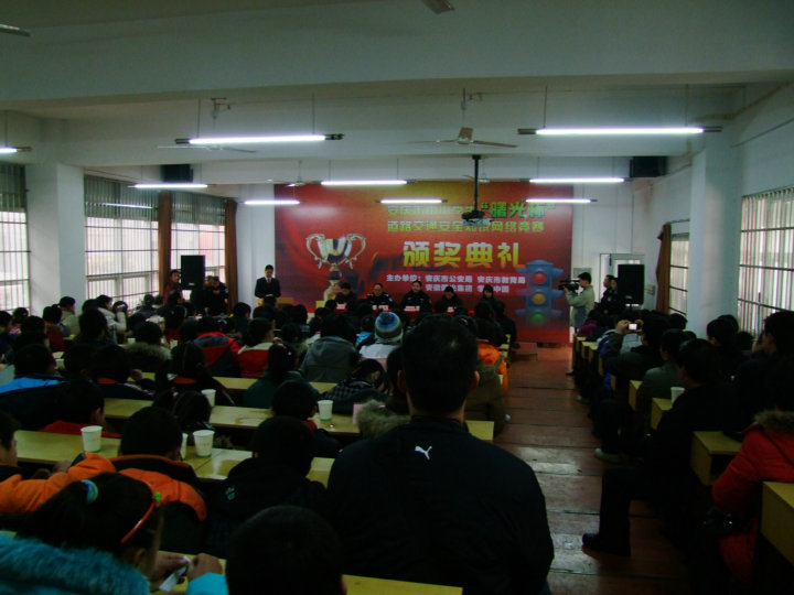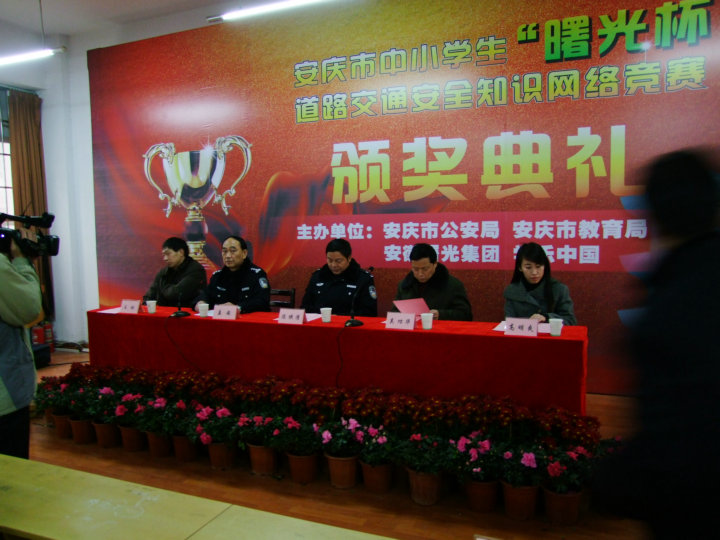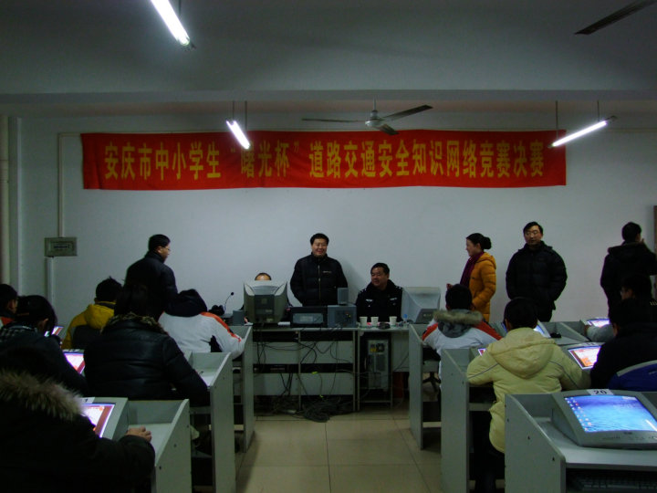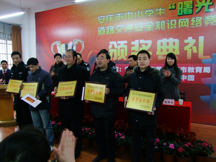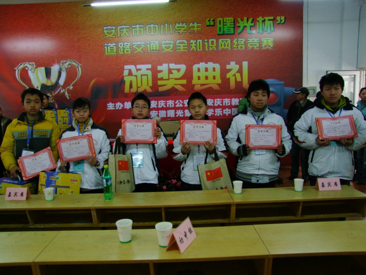 2010年1月16日(星期六)上午9:20,安慶市中小學(xué)生“曙光杯” 道路交通安全知識(shí)網(wǎng)絡(luò)競(jìng)賽決賽及頒獎(jiǎng)典禮在安慶二中(南區(qū))隆重舉行。本次比賽歷時(shí)三個(gè)多月,分為初賽和決賽兩個(gè)賽段,參賽選手達(dá)到上萬(wàn)人,而最終進(jìn)入(初中組)決賽的只有50人,我校共有6名選手進(jìn)入決賽。上午9:20初中組現(xiàn)場(chǎng)決賽開(kāi)始,9:40結(jié)束;小學(xué)組決賽9:50開(kāi)始,10:10結(jié)束。10:20,在安慶市交通音樂(lè)廣播主持人文俊的主持音下頒獎(jiǎng)典禮開(kāi)始,市公安局黨委副書(shū)記陳俠清、市教育局副局長(zhǎng)吳功華、安徽曙光集團(tuán)總經(jīng)理王林、市交警支隊(duì)大隊(duì)長(zhǎng)姜安、學(xué)樂(lè)中國(guó)教育網(wǎng)副經(jīng)理高明爽在主席臺(tái)就座,出席本次頒獎(jiǎng)典禮的還有市教育局、市公安局領(lǐng)導(dǎo),各大媒體,市、區(qū)、縣中小學(xué)參賽隊(duì)領(lǐng)隊(duì)、參賽隊(duì)員等。通過(guò)緊張而激烈的角逐,我校初一(4)班嚴(yán)立祺、初一(6)班魏興榮獲二等獎(jiǎng),初一(6)班馬潔、初一(8)班徐宏帥、初二(8)班汪鑫、汪子鑫榮獲三等獎(jiǎng);同時(shí)我校獲得優(yōu)秀組織獎(jiǎng)和一千元獎(jiǎng)金。通過(guò)這次比賽,不僅增強(qiáng)了學(xué)生道路交通安全知識(shí),而且豐富了學(xué)生們的課余生活,讓學(xué)生們?cè)陉J關(guān)游戲中學(xué)到了知識(shí)。