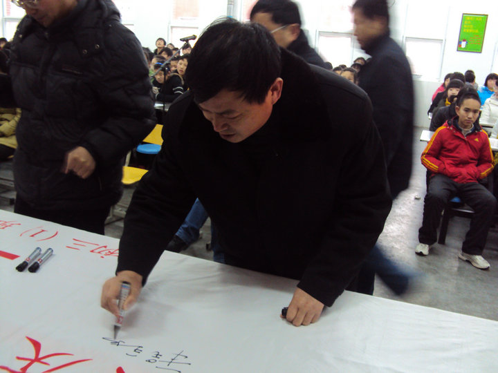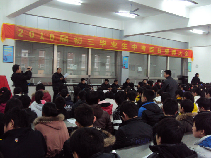 在“真心英雄”的歌聲中,初三年級(jí)全體師生在“中考百日誓師大會(huì)”的橫幅上莊嚴(yán)地簽下自己的名字。