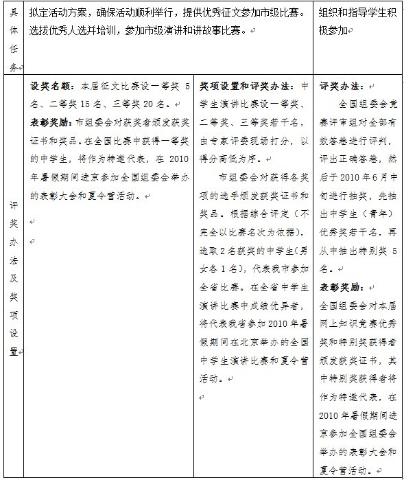 方式:初一、二、三年級各班推薦一名參賽選手進行寫稿,均由本班班主任推薦、語文老師指導(dǎo),2010年4月8日交稿(交至德育部,過期稿件,不予參加比賽)。由學校德育部、語文組評出2篇優(yōu)秀文章(其余均被評為校級獎)報送至市組委會辦公室。市組委會將邀請有關(guān)專家對參賽征文進行評審,評出一、二、三等獎,同時對優(yōu)秀征文各選送5篇參加全省比賽,省組委會將選送全省中學生優(yōu)秀征文參加全國比賽。全市部分優(yōu)秀征文將在《青少年文匯》上發(fā)表。