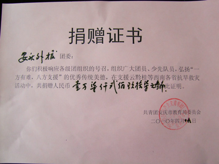 為進一步弘揚“一方有難、八方支援”的優(yōu)秀傳統(tǒng)美德,培育青少年助人為樂的高尚情操,安慶市外國語學校西區(qū)團委號召全體師生向災區(qū)捐款,獻出一片愛心。