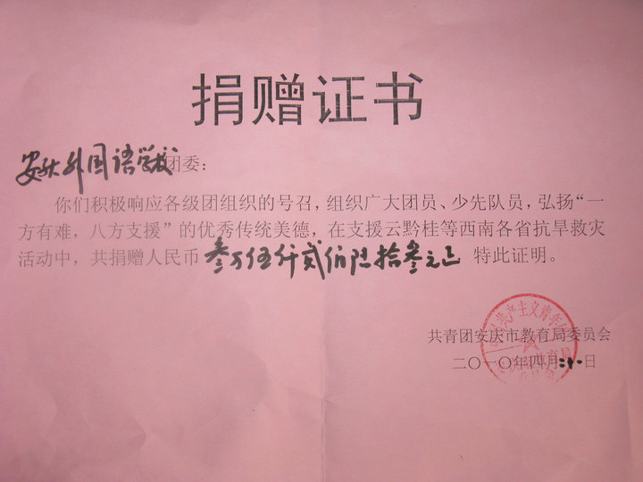 自去年入秋以來,云南、貴州、四川、廣西、重慶等省市遭遇了百年不遇的大旱,給災(zāi)區(qū)城鄉(xiāng)居民生產(chǎn)生活帶來了嚴(yán)重影響,造成了巨大損失。4月9日,學(xué)校團(tuán)委積極響應(yīng)市教育局團(tuán)委的號(hào)召,發(fā)動(dòng)全校師生員工積極捐款,支援西南災(zāi)區(qū)抗旱救災(zāi)。