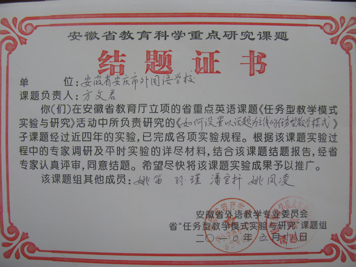 熱烈祝賀我校省重點英語課題《如何設置以話題為主線的任務型教學模式》順利結題