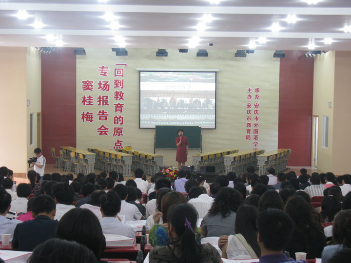 6月6日上午,陽(yáng)光燦爛,微風(fēng)習(xí)習(xí),在安慶市外國(guó)語(yǔ)學(xué)校嶄新的報(bào)告廳里,市教育局吳功華副局長(zhǎng)、張復(fù)雙書(shū)記和來(lái)自全市的五百多位中小學(xué)校長(zhǎng)、班主任濟(jì)濟(jì)一堂,共同觀摩了全國(guó)著名特級(jí)教師竇桂梅的語(yǔ)文課堂教學(xué),聆聽(tīng)了竇桂梅老師的專(zhuān)題講座《回到教育的原點(diǎn)》。這次竇桂梅老師專(zhuān)場(chǎng)報(bào)告會(huì)由安慶市教育局主辦,安慶市外國(guó)語(yǔ)學(xué)校承辦,旨在進(jìn)一步推進(jìn)我市基礎(chǔ)教育教學(xué)改革,提升中小學(xué)班主任管理工作水平。