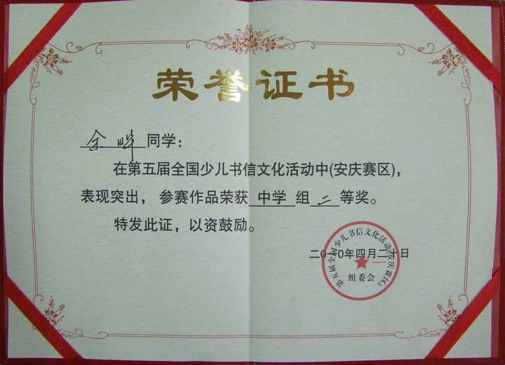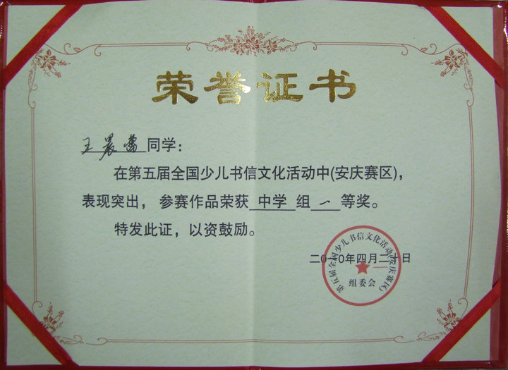 “第五屆全國少年兒童書信文化活動(安慶賽區(qū))”評選結(jié)果已經(jīng)揭曉,在約32萬件參賽書信中,我校選手脫穎而出,初三(8)班王晨蕾同學(xué)榮獲市一等獎,初二(1)班馬輝煌同學(xué)、初二(2)班余曄同學(xué)榮獲二等獎,另有多名同學(xué)獲得三等獎、鼓勵獎。本次活動,同學(xué)們緊緊圍繞主題,利用散文、詩歌等多種表現(xiàn)形式,很好地抒發(fā)了自己對祖國60周年華誕的祝福,也很好地弘揚了中華書信文化。