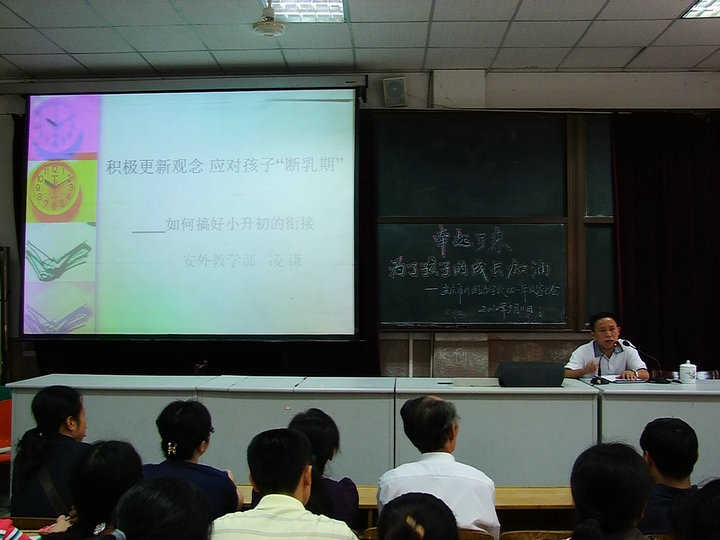 九月十一日上午,安慶市外國語學(xué)校召開了一年一度的初一年級新生家長會。本次家長會的主題是“牽起手來為了孩子的成長加油”。早晨八點(diǎn)半,隨著教學(xué)部凌主任的講話開始,家長會也正式拉開了帷幕。所有初一新生的家長都濟(jì)濟(jì)一堂,與教師親密接觸,共同探討如何在緊密家校聯(lián)系的前提下搞好學(xué)生的雙向(學(xué)校、家庭)教育。凌主任首先代表學(xué)校對于家長的到來表示了熱烈的歡迎,并對初一新生目前的學(xué)習(xí)狀況了進(jìn)行了大致的介紹。隨后,黃校長將學(xué)校的一些基本情況做了詳細(xì)的介紹,并就其中的管理制度及紀(jì)律規(guī)范做了著重強(qiáng)調(diào),她語重心長地告訴諸位家長“安外是在把教育當(dāng)作事業(yè)來做!”在要求家長積極配合學(xué)校教育的同時也要對學(xué)校放心,對老師放心,對孩子關(guān)心、讓孩子開心。只有家庭和學(xué)校密切配合、共同努力,孩子的成績才能有得力的保障。