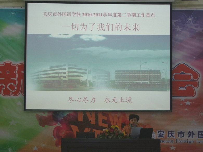 告別了溫馨快樂的寒假,我們又迎來了一個緊張、充實又富有挑戰(zhàn)的新學(xué)期。2月19日下午,安慶市外國語學(xué)校2010-2011學(xué)年度第二學(xué)期開學(xué)工作會議在報告廳如期舉行,會議由黃文莉校長主持。我校全體教師齊聚一堂,一起回眸上學(xué)期曾經(jīng)走過的風(fēng)風(fēng)雨雨,展望新學(xué)期美好的藍(lán)圖。