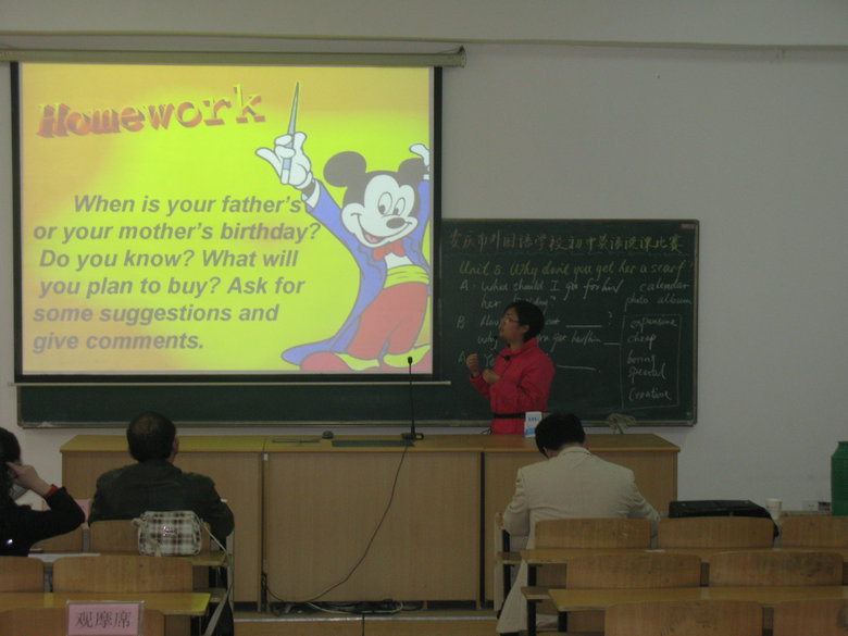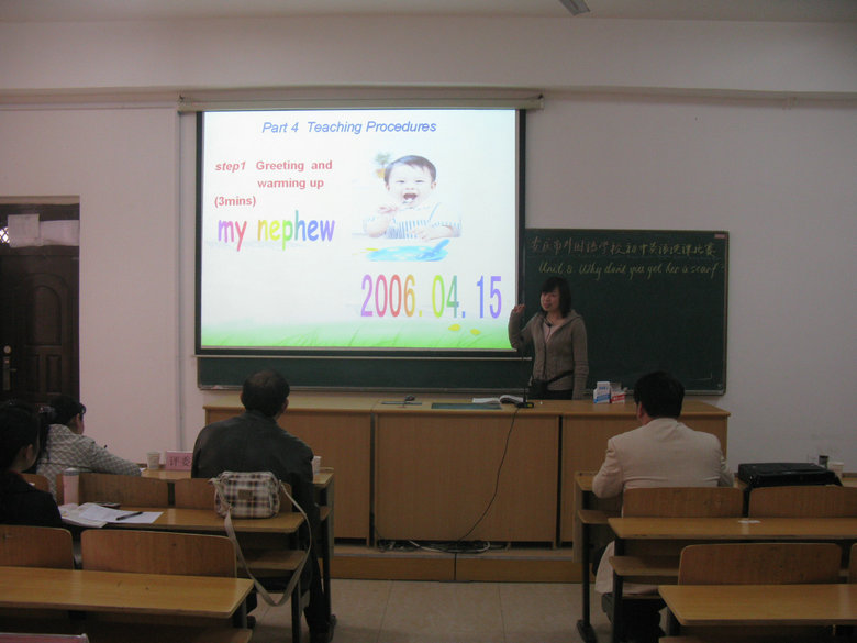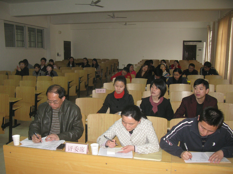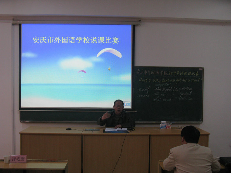 2011年4月12日下午2:00,在安慶市外國語學校東校區(qū)初中部合班教室隆重舉行本校初中英語說課比賽,經(jīng)過三月份的初輪選拔后有五位老師晉級今天的決賽。親臨現(xiàn)場觀摩的有我校高中部、初中部、小學部近50名英語教師。此次說課比賽的課題為新目標八年級下冊的第八單元SectionA部分內(nèi)容,范圍廣內(nèi)容多,需要對教材有宏觀的把握,合理的考量和適當?shù)牟眉?。參賽教師提前一天得知課題,精心準備后,臨時抽簽排序,進行十分鐘左右的說課,析教材,說教法學法,談教學過程,或從容不迫,娓娓道來,或激情四溢,神采飛揚,奇思妙想閃爍其間,教育智慧充分展現(xiàn)。