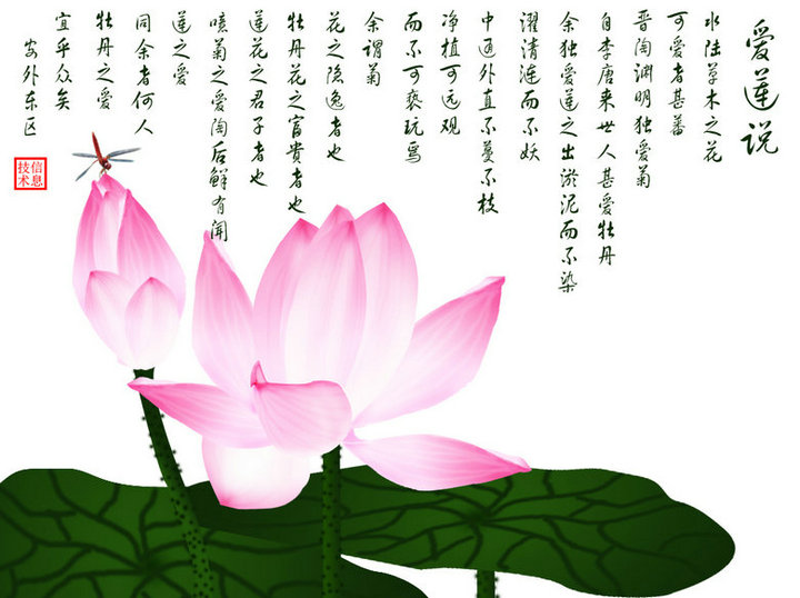 作品說明:結(jié)合八年級(jí)所學(xué)語文課文內(nèi)容,通過電腦鼠繪蓮花,托物言志,讓學(xué)生體會(huì)該文所體現(xiàn)的不慕名利,潔身自好,不與世俗同流合污的態(tài)度同時(shí)也表達(dá)了作者對(duì)追名逐利,趨炎附勢的鄙棄。歌頌了君子“出淤泥而不染,濯清漣而不妖”的美德,不與世俗同流合污的高尚情操。該作品首先運(yùn)用了PHOTOSHOP中的路徑工具繪制蓮花等外形路徑、接著運(yùn)用漸變填充、加深減淡等工具進(jìn)行色彩填充、最后將文字、各圖層按作品的中心思想進(jìn)行組合排列。