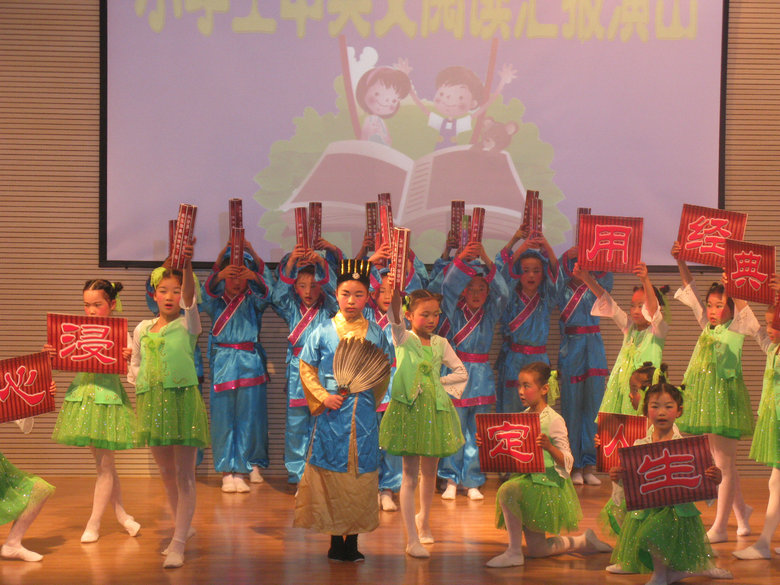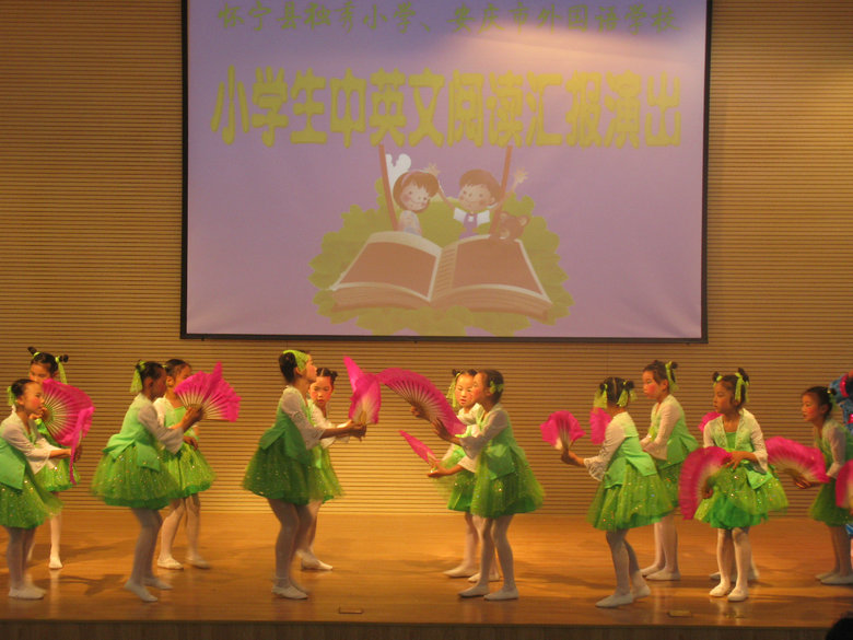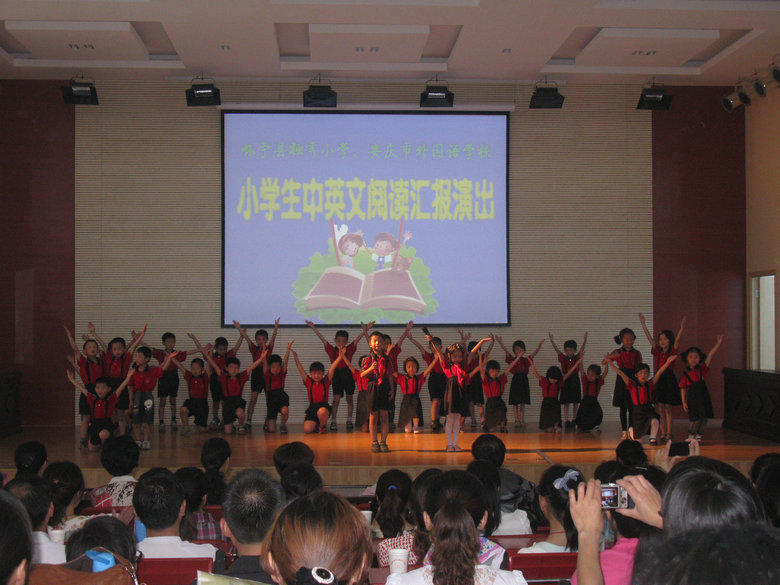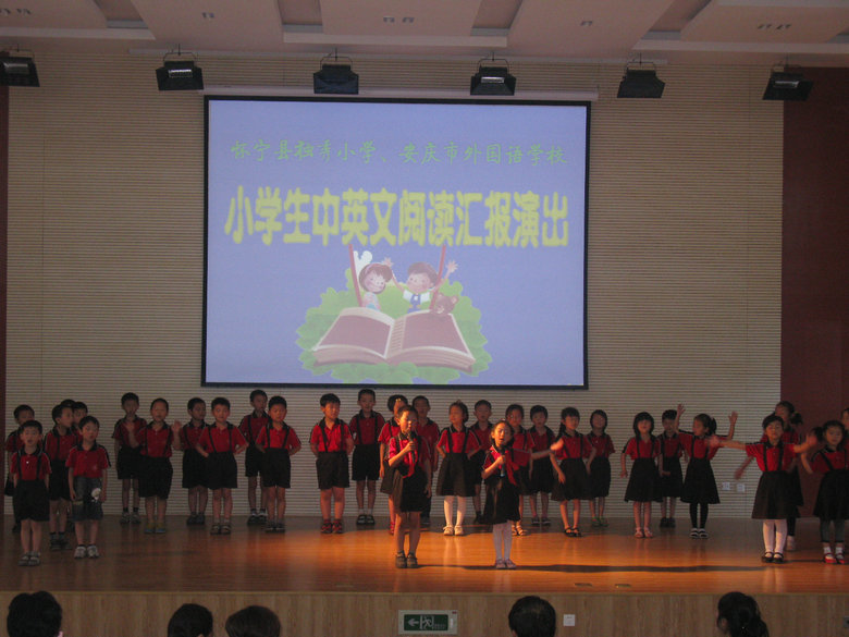 5月21日上午懷寧縣獨(dú)秀小學(xué)部分師生應(yīng)邀到我校參加小學(xué)生中英文閱讀匯報活動。黃文莉校長致熱情洋溢的歡迎詞;教師代表王娟對同學(xué)們閱讀情況進(jìn)行了總結(jié),并向同學(xué)們提出了讀書好,讀好書,好讀書的要求。獨(dú)秀小學(xué)同學(xué)們帶來了精彩的節(jié)目《七色光》《誡子書》;外國語學(xué)校小學(xué)部演出了13個節(jié)目,有發(fā)人深思的《陶罐與鐵罐》等課本劇,有輕快幽默的《小豬變形記》《淘氣包馬小跳》等課外劇表演,有《猴子撈月》《生蛋的鵝》等英語童話故事表演,有激烈的《曹操是奸雄還是英雄》辯論表演,還有小學(xué)部藝術(shù)團(tuán)同學(xué)們歡快的舞蹈《DoReMi》……節(jié)目精彩紛呈,獲得了參會的老師、學(xué)生及家長代表的陣陣掌聲,兩校的學(xué)生分享了讀書的快樂。