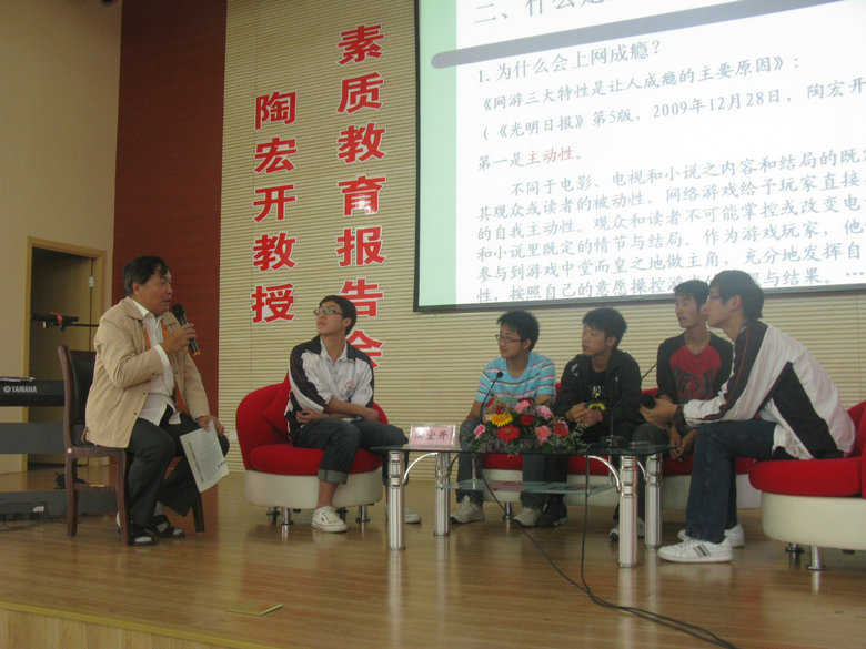 大會(huì)由安慶市外國(guó)語(yǔ)學(xué)校校長(zhǎng)黃文莉主持。在全場(chǎng)師生熱烈的掌聲中,有“中國(guó)戒除網(wǎng)癮第一人”之稱的陶宏開(kāi)教授登上了講臺(tái),以一首自創(chuàng)自彈自唱的勵(lì)志英文歌曲拉開(kāi)了演講的序幕。陶教授以風(fēng)趣幽默的語(yǔ)言闡述了什么是素質(zhì)教育,“素質(zhì)教育”就是通過(guò)引導(dǎo)學(xué)生全面提升“心理素質(zhì)、專(zhuān)業(yè)素質(zhì)、綜合素質(zhì)”,從而達(dá)到知且識(shí)的過(guò)程。通過(guò)進(jìn)行“素質(zhì)教育”,實(shí)現(xiàn)“道德重建”,最終使迷網(wǎng)青少年戒除網(wǎng)癮,健康上網(wǎng)。通過(guò)實(shí)行“素質(zhì)教育”,實(shí)現(xiàn)成人、成才、成功。陶教授除了以大量的事實(shí)和精辟的理論指引學(xué)生,還運(yùn)用多媒體播放自己拍攝創(chuàng)作演唱的MTV《愛(ài)》、《學(xué)費(fèi)》等貼近學(xué)生生活的歌曲感染鼓舞學(xué)生,以互動(dòng)討論的形式啟發(fā)學(xué)生思考理想、生命、事業(yè)、學(xué)習(xí)等問(wèn)題……整個(gè)會(huì)場(chǎng)高潮迭起,同學(xué)們也都積極踴躍的發(fā)言,氣氛熱烈,掌聲不斷。