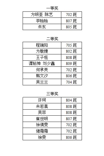 “青春因歌聲而飛揚,我的音樂我做主”,安慶外國語學校東區(qū)2012年校園歌手大賽于2012年5月9日晚18:40在報告廳舉行。音樂響起,場內(nèi)座無虛席,一首《翅膀》拉開比賽序幕,一首《可惜不是你》掀起比賽高潮,一首《琉璃月》讓比賽完美謝幕。賽中,還有Khim等幾位老師的精彩助陣,査道熹老師的一首《父親》讓整個賽場洋溢在一種溫馨的氛圍中。整個比賽持續(xù)了兩個小時,大賽設一等獎3名、二等獎7名、三等獎7名,比賽結(jié)果附表如下: