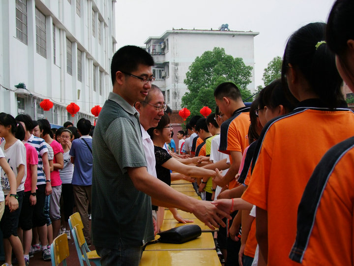 最后,在《友誼地久天長》的背景音樂中,全體同學(xué)依次走上臺與老師們一一握手言別。在握手時,在擁抱中,在音樂聲里,很多人都流下了眼淚,就連老天這時也灑下了幾滴小雨,仿佛也為這場景感動落淚。