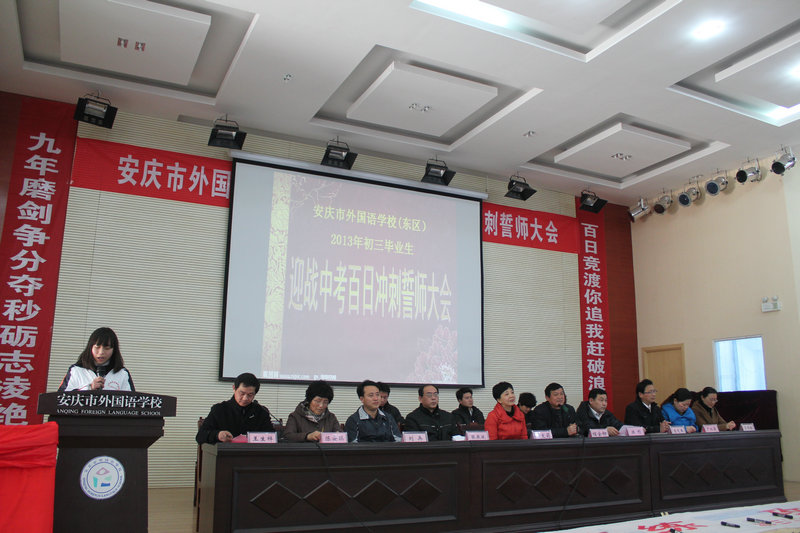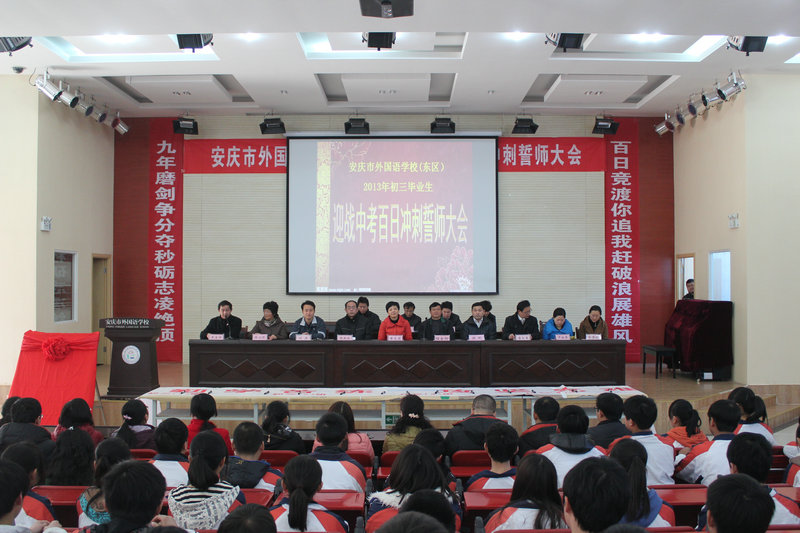 張燕斌副校長給初三師生作了激情澎湃的動員講話,分析了中考的形勢,鼓舞師生們要堅定信心、滿懷激情、充分把握這一百天的時間,凝心聚力,打好這場中考攻堅戰(zhàn),為安外2013年中考創(chuàng)造更大的輝煌。教師宣誓、學生宣誓把大會推向了高潮。莊嚴神圣的誓詞,表達了師生們對取得中考佳績的堅定信念和必勝信心!