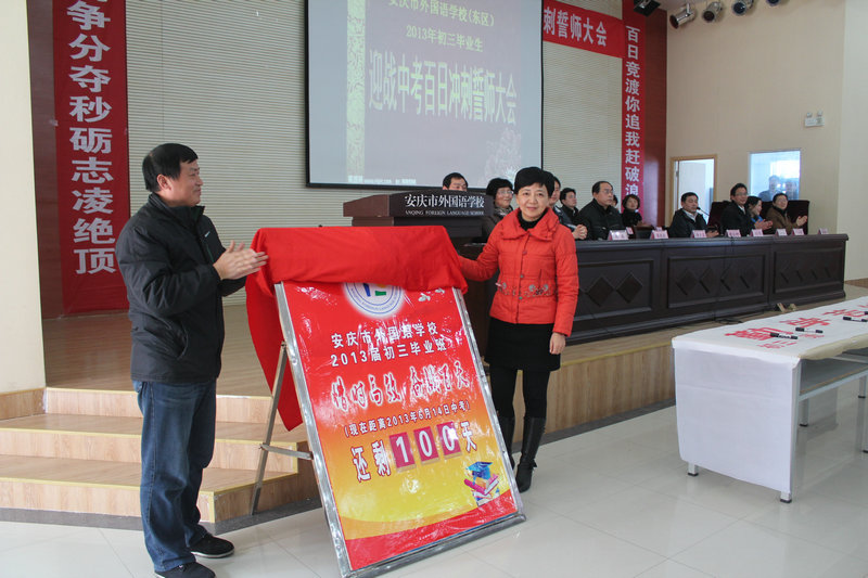 黃文莉校長、程金柳副校長為“2013屆中考100天倒計時”揭牌。