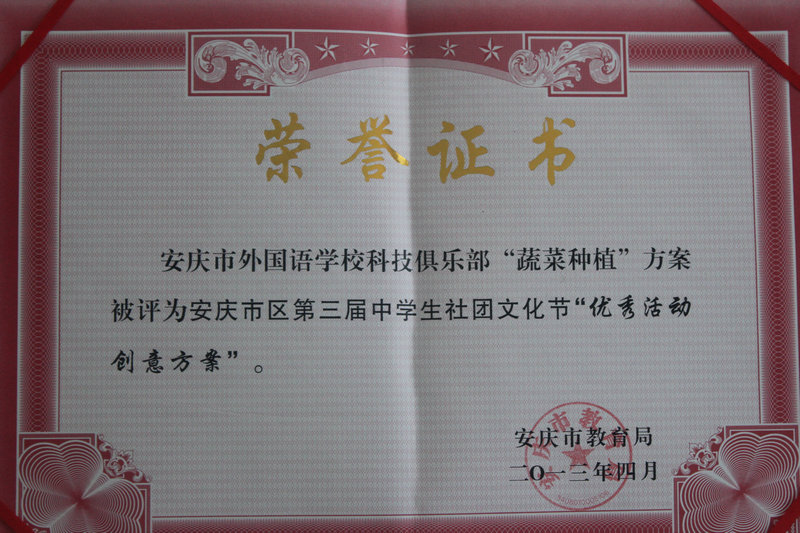 我?!笆卟朔N植”榮獲安慶市區(qū)第三屆中學生社團文化節(jié)優(yōu)秀活動創(chuàng)意方案