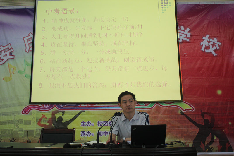 最后由唐文生校長助理為大家提出要求,唐助談到如何在38天里創(chuàng)造中考奇跡?一是堅(jiān)定目標(biāo),二是每日三省做到今日事今日畢。他還要求我們同學(xué)們做好知識準(zhǔn)備和技巧準(zhǔn)備,爭取以優(yōu)異的成績感恩老師、感恩父母。