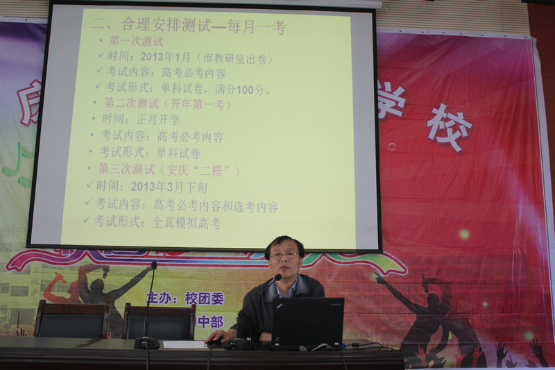 第一階段,家長在校報(bào)告廳集中開會。會議由高中部唐文生主任主持,家長們先后聽取高中部錢智宏副主任和張燕斌副校長的報(bào)告。首先錢主任把學(xué)校在高三年級開展的教育教學(xué)工作和高考前的安排對家長朋友們進(jìn)行匯報(bào)。接著張校長為家長詳細(xì)分析學(xué)生現(xiàn)階段的學(xué)習(xí)特點(diǎn)并給與家長的四點(diǎn)建議(即前瞻而不急躁、超脫而又現(xiàn)實(shí)、沉著而不凝重、輕松而又泰然)。
