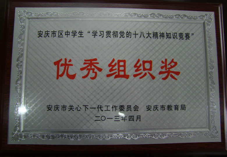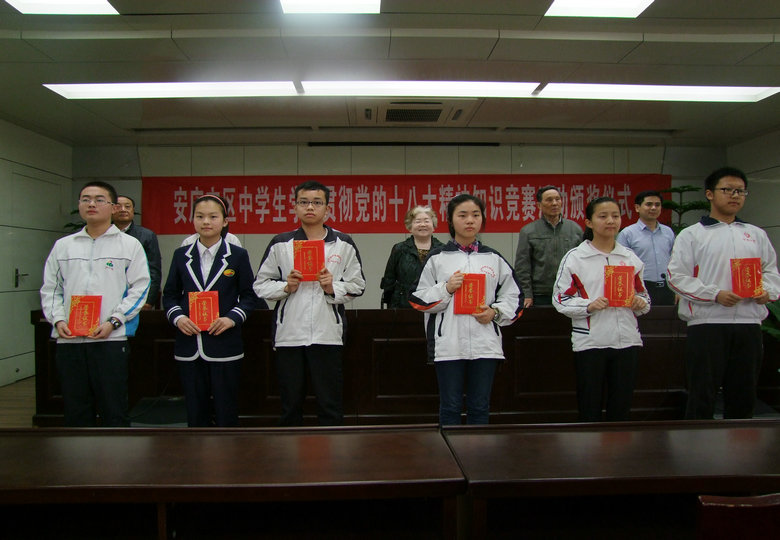 2013年5月18日上午10:30,在市教育局十樓會(huì)議室舉行了安慶市區(qū)中學(xué)生“學(xué)習(xí)貫徹黨的十八大精神知識(shí)競(jìng)賽”活動(dòng)頒獎(jiǎng)儀式。安慶市外國(guó)語(yǔ)學(xué)校在此項(xiàng)活動(dòng)中榮獲優(yōu)秀組織獎(jiǎng);同時(shí),該競(jìng)賽活動(dòng)評(píng)出優(yōu)秀獎(jiǎng)237名,鼓勵(lì)獎(jiǎng)235名。各校組織30人參賽,安外西區(qū)30名參賽選手均獲得優(yōu)秀獎(jiǎng),其中初二(3)班汪玉瑞、初二(5)班黃凱、初二(9)班徐镕杰、初二(10)班汪佳藝榮獲優(yōu)秀獎(jiǎng)前四名。