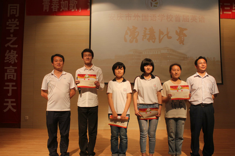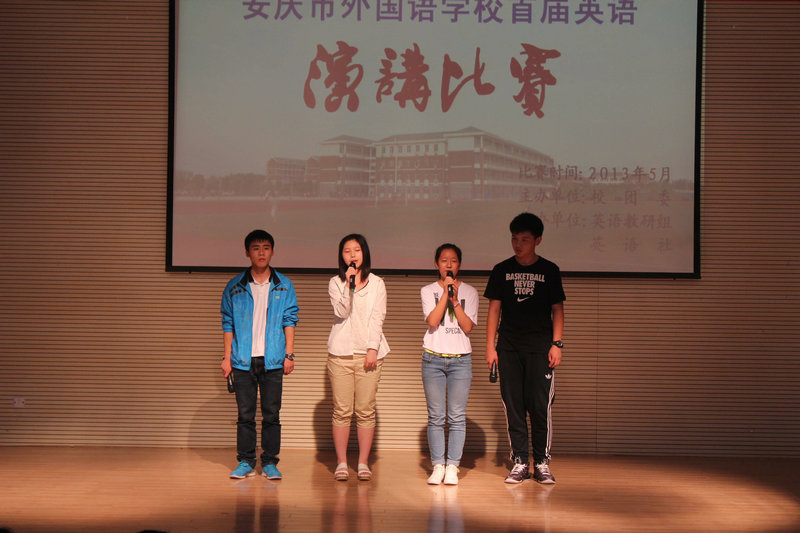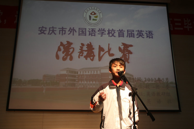 為了豐富廣大同學(xué)們的課余生活,加強(qiáng)英語的學(xué)習(xí)和交流,提高同學(xué)們學(xué)習(xí)英語的積極性,給同學(xué)們提供一個(gè)展現(xiàn)自我,提升自我的機(jī)會(huì)和舞臺(tái)。2013年5月29日安慶市外國(guó)語學(xué)校首屆英語演講比賽在校報(bào)告廳隆重舉行,本活動(dòng)由校團(tuán)委和英語教研組聯(lián)合主辦,英語社承辦。比賽分為高中組、初一年級(jí)組、初二年級(jí)三個(gè)組別,共77位選手參賽,分三場(chǎng)進(jìn)行。擔(dān)任此次演講比賽的評(píng)委有:儲(chǔ)友東、畢金、高琴、余佳佳、姚鳳凌、江早春、汪霞、雷羅霞、胡成文、李蓉、趙元元、朱仁革以及外教Khim、Bev。 邵偉、馬亞楠和王天宇、韓靜霆同學(xué)擔(dān)任此次比賽的主持。