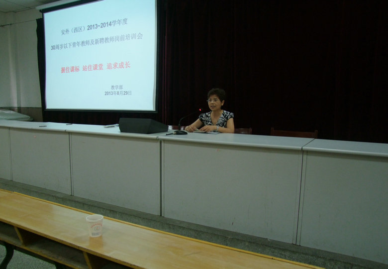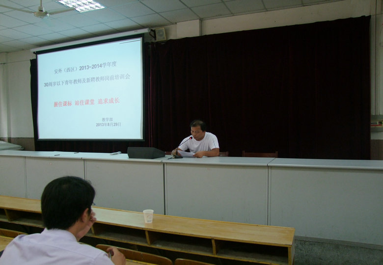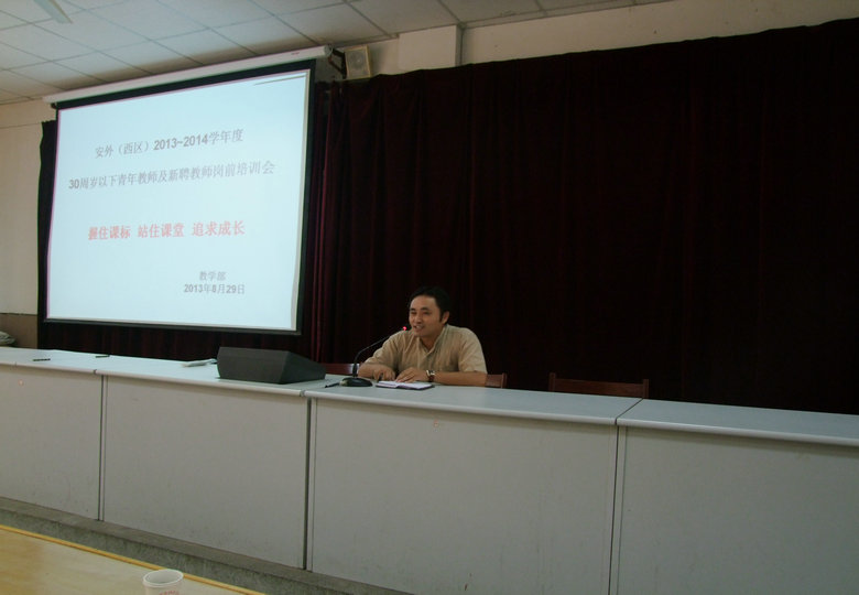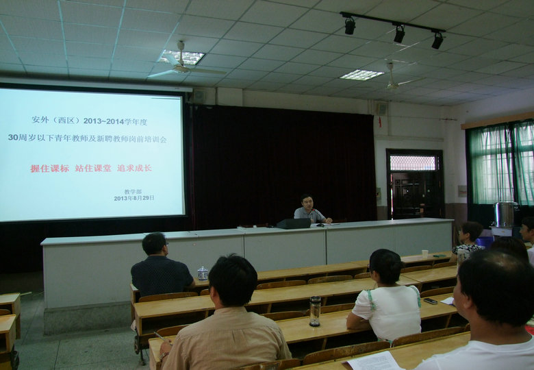 為幫助教師盡快適應(yīng)崗位工作,促進教師專業(yè)成長,2013年8月29日上午,安外(西區(qū))教學(xué)部在校報告廳召開了青年教師及新聘教師崗前培訓(xùn)會。會議由教學(xué)部蘆丹主任主持,孫英校長、陳一平副校長出席了此次會議。