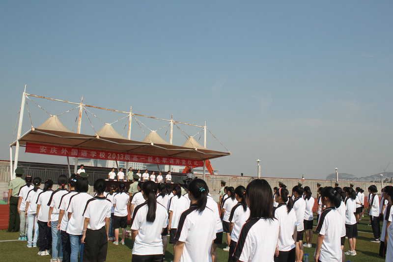 2013年9月2號9點我校2013級高一新生軍訓開營儀式在校田徑場隆重舉行。本期軍訓時間為9月2號到8號。參加本次開營儀式的安慶武警五支隊張啟高副大隊長、校長黃文莉、副校長程金柳、總務副校長嚴紅萍、校長助理劉兵、校長助理唐文生、高中部主任錢智宏、高中部副主任徐海宏、高中部副主任兼國際部主任徐最太、高一年級長何泰峰、各連教官、各連正副輔導員老師和近500名2013級學生。