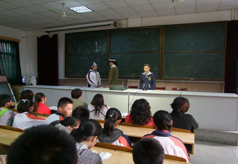 有的同學(xué)在演講中配合了適當(dāng)?shù)谋砬?,動作等肢體語言,讓我們感覺是在“視聽”故事。更有些同學(xué)采用了小組表演的形式,為我們獻上了現(xiàn)場版的英文話劇,著實讓在座的我們?yōu)橹@嘆!