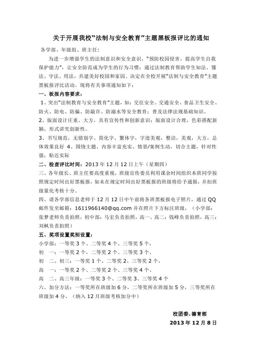 關(guān)于開展我?!胺ㄖ婆c安全教育”主題黑板報(bào)評比的通知
