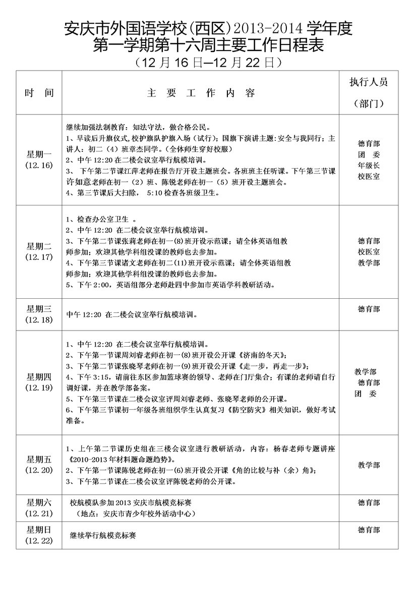 第十六周主要工作日程表