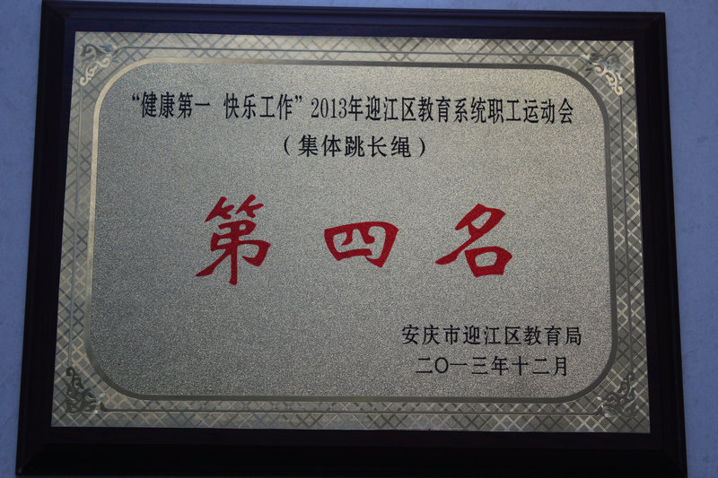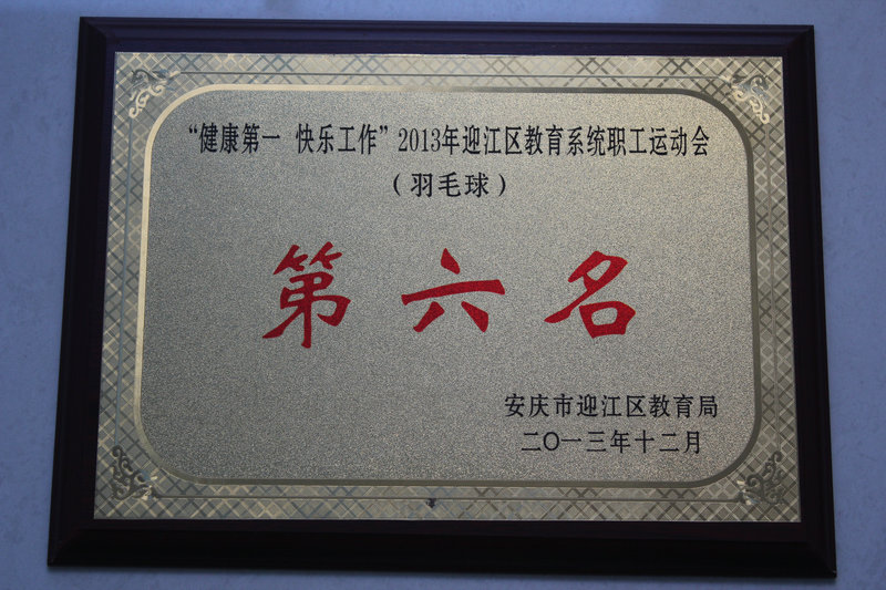 2013年12月21、22日,迎江區(qū)教育局在碧桂園學校舉辦了為期兩天的“健康第一,快樂工作”教工運動會。我校代表隊全體運動員發(fā)揚頑強拼搏,團結協(xié)作的精神,在運動場上書寫華麗篇章。由嚴紅萍副校長等12名隊員組成的跳繩隊榮獲第四名;由勞果林主任和肖俊老師組成的羽毛球男女混雙力克勁敵,榮獲第六名。在19支代表隊的激烈爭奪賽中,我校代表隊團體總分并列第八名。