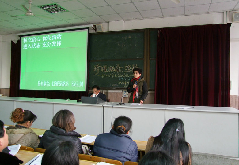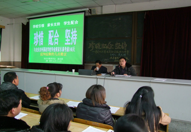 1月18日,應(yīng)我校孫英校長(zhǎng)的邀請(qǐng),安慶市教育學(xué)會(huì)專(zhuān)家高光煌老師來(lái)我校開(kāi)展講座,這次的講座主題為“珍惜、配合、支持”,是和畢業(yè)班家長(zhǎng)談考前146天應(yīng)知應(yīng)做的事。會(huì)議由教學(xué)部主任蘆丹主持,他首先向各位家長(zhǎng)們介紹了高老師,并簡(jiǎn)要說(shuō)明了本次講座的目的。接下來(lái)是高老師精彩的講座,他開(kāi)頭就強(qiáng)調(diào)現(xiàn)在是奠基人生的最佳學(xué)習(xí)時(shí)期,家長(zhǎng)和學(xué)生都要珍惜它,真是“辛苦146天,幸福一百年”!下面他就針對(duì)各位家長(zhǎng)提出了具體而細(xì)致的要求,大家紛紛拿起筆記下了高老師寶貴的建議。講座結(jié)束后,孫校長(zhǎng)做了總結(jié)發(fā)言,她誠(chéng)懇地說(shuō)道這次講座是給全體家長(zhǎng)送來(lái)了幸福的禮包。