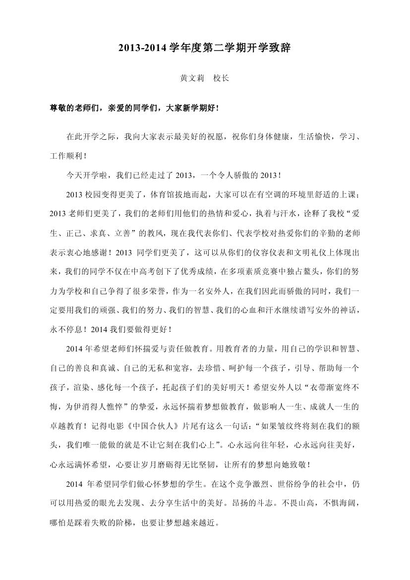 黃校長2013-2014學(xué)年度第二學(xué)期開學(xué)致辭