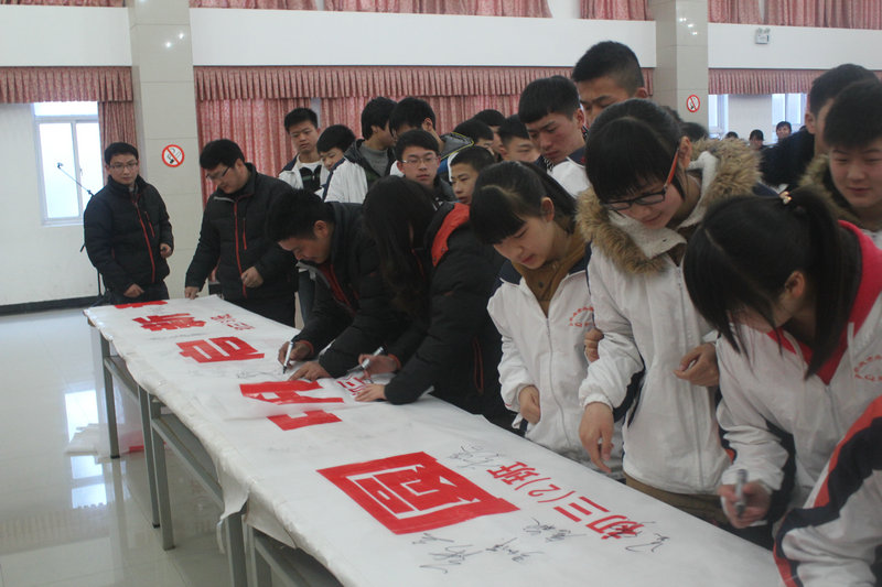學(xué)校全體初三師生在會上還進(jìn)行了宣誓,作出鄭重承諾。鏗鏘的誓言中燃燒著青春的理想,激蕩著拼搏的決心,使人熱血沸騰。隨后,黃文莉校長和程金柳副校長為倒計時揭牌,大會在莊嚴(yán)而熱烈的簽字儀式中落下帷幕。
