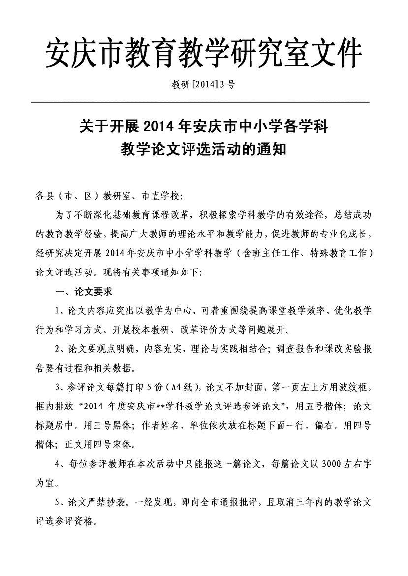 關(guān)于開展2014年安慶市中小學(xué)各學(xué)科教學(xué)論文評選活動的通知