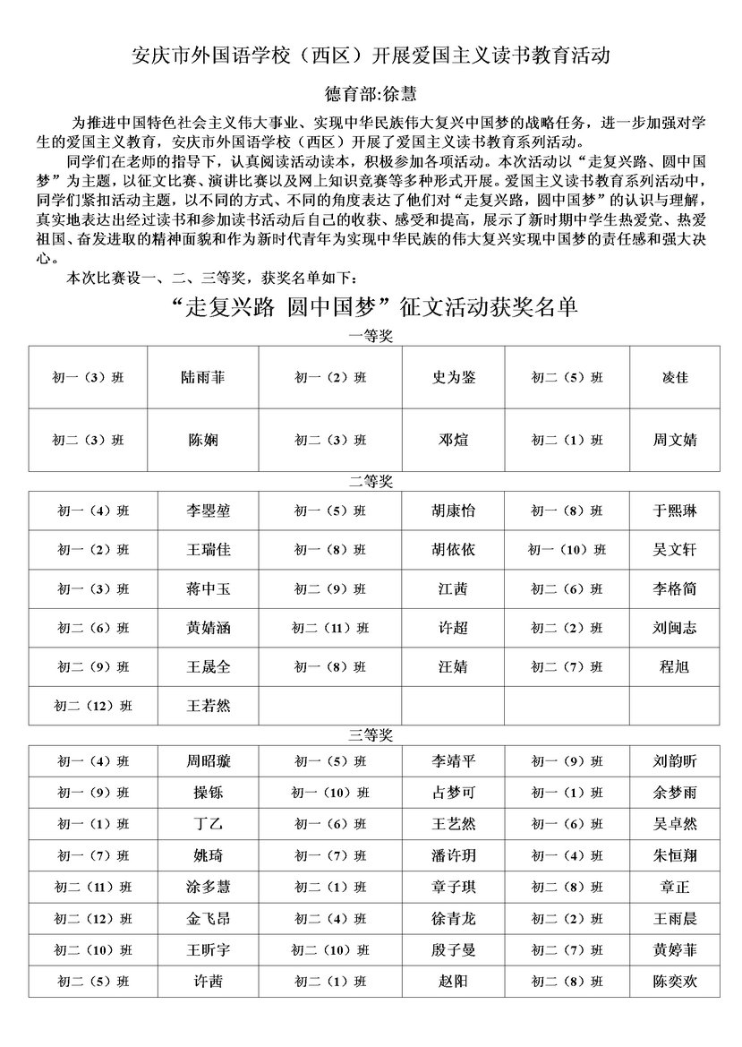 安慶市外國語學(xué)校(西區(qū))開展愛國主義讀書教育活動