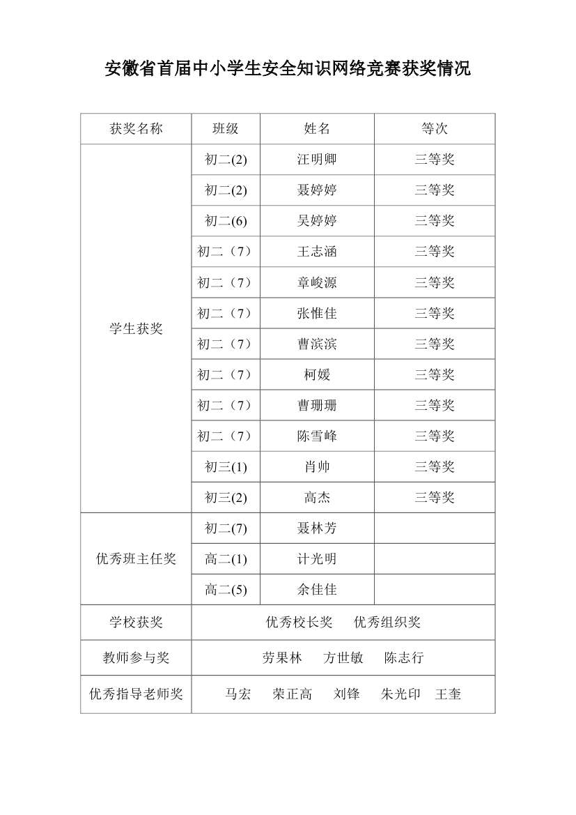安徽省首屆中小學(xué)生安全知識網(wǎng)絡(luò)競賽獲獎情況